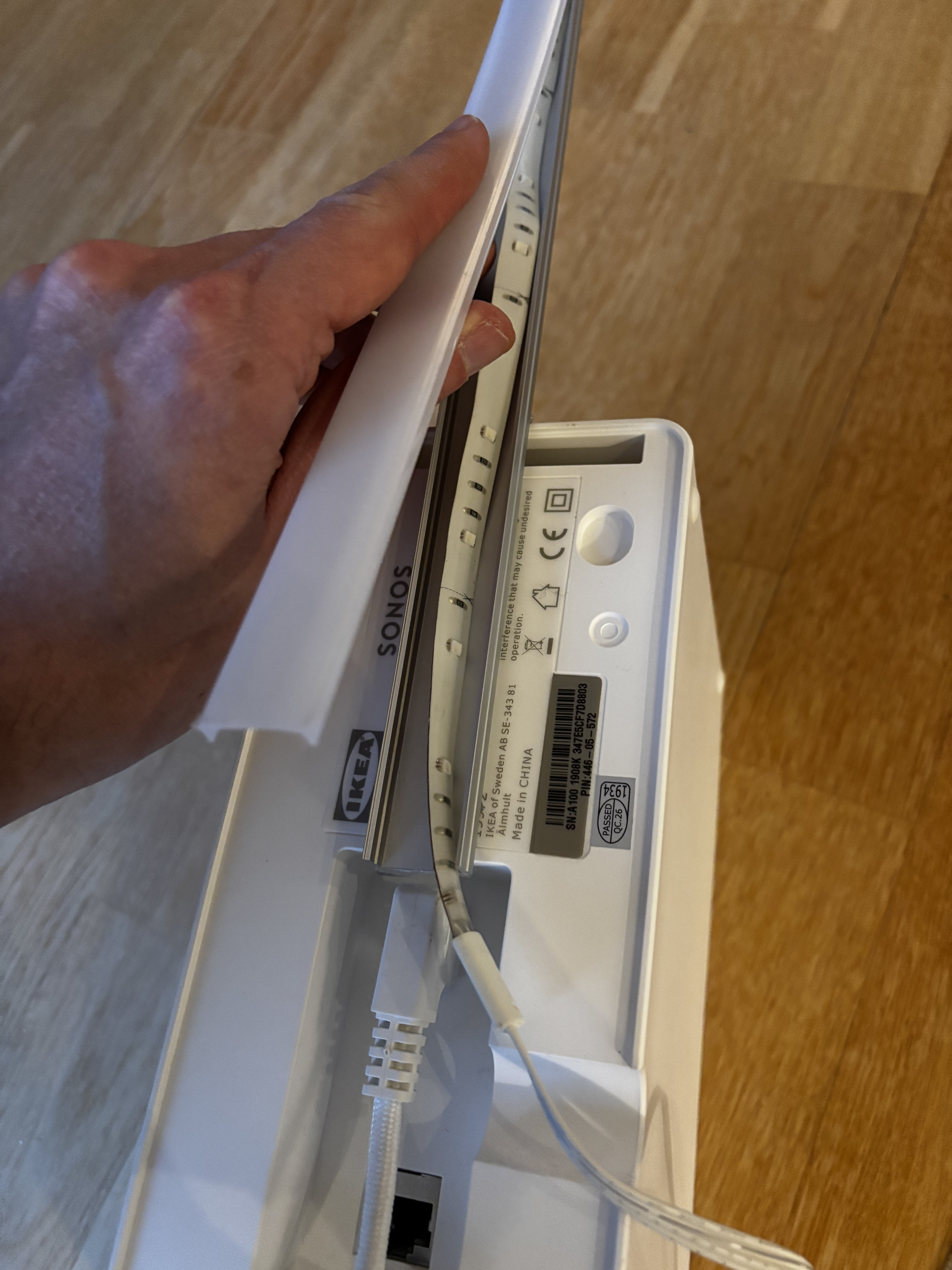 - Secure the assembled light strip to the SYMFONISK speaker using strong double-sided tape or glue — whatever you prefer.